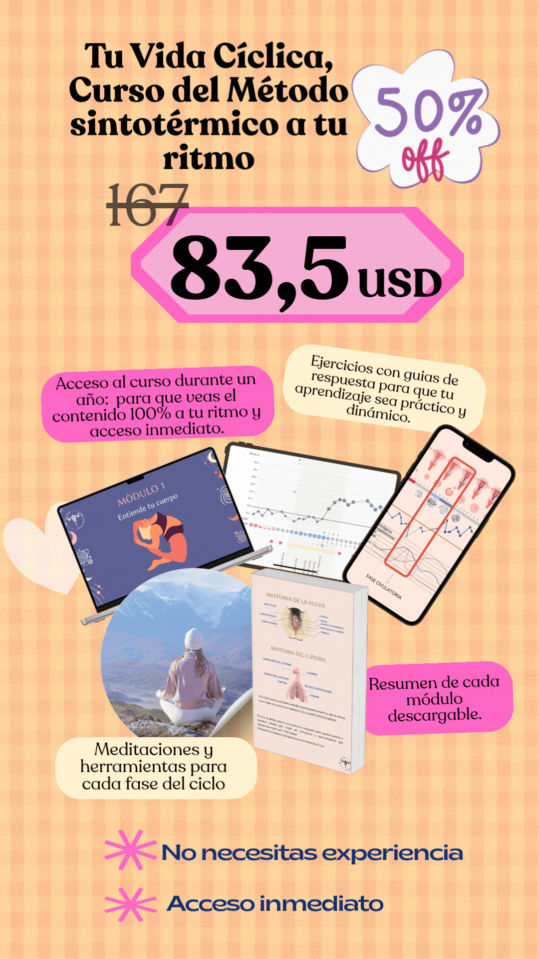 Mi curso Tu Vida Cíclica en su versión autodidacta o a tu ritmo donde aprendemos el método sintotérmico tiene un valor de 167 usd
