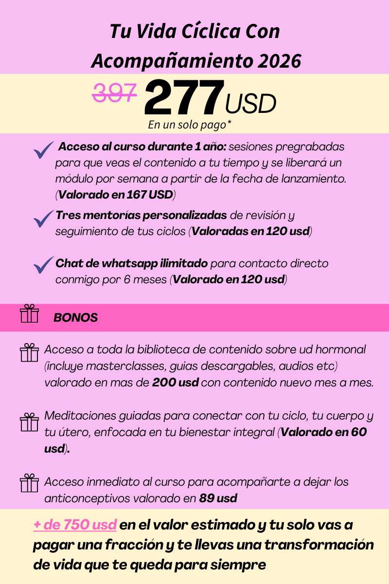 El curso Tu Vida Cíclica en su versión con acompañamiento donde aprendemos el método sintotérmico y que te incluye en ese acompañamiento TRES sesiones EN VIVO grupales y TRES mentorias completamente personalizadas 1:1 donde nos sentamos tu y yo a evaluar tu ciclo, ver si confirmas ovulación, buscar herramientas específicas para tu caso entre otros, tiene un valor de 389 usd